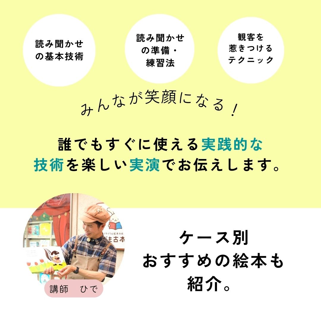 読み聞かせの「準備・練習法」から、「基本技術」、「観客を惹きつけるテクニック」など、読み聞かせで誰でもすぐに使える実践的な技術を実演でお伝えします。