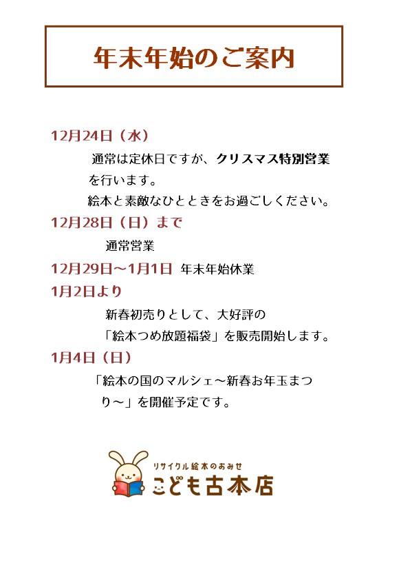 12月27日(土)~1月4日(日)まで 年末年始休業