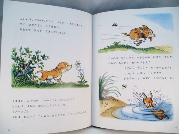 「ニャーンといったのはだれ?」と子犬はネズミや猛犬にきいてまわり、いろんな失敗をします。幼児が周囲への認識を深めていく過程を描く。
