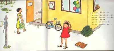 絵本の状態:経年による日焼け。表面と表題紙、背、内容にしわ多し。角にわずかに擦れ。