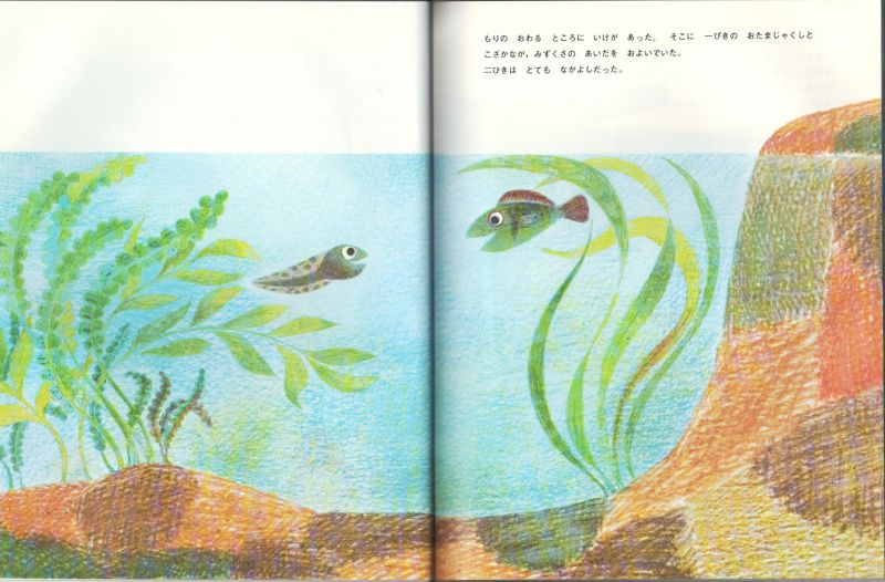 おたまじゃくしが、蛙になって幼馴染みの魚を訪ねてきます。魚は蛙の話を聞き、外の世界をみたくなり、蛙の真似して池を飛び出してしまいます。さあ大変・・・
