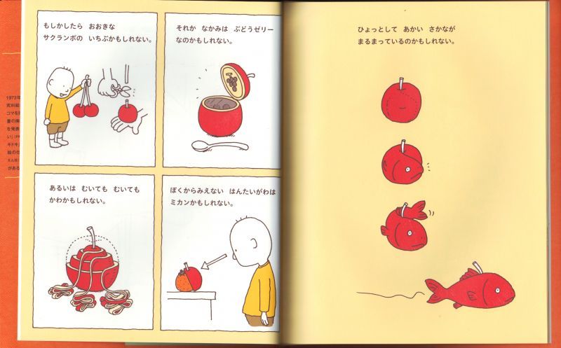 テーブルの上にりんごがおいてあった。 ......でも、......もしかしたら、これはりんごじゃないかもしれない。もしかしたら、大きなサクランボのいちぶかもしれないし、心があるのかもしれない。実は、宇宙から落ちてきた小さな星なのかもしれない...... 「かんがえる」ことを果てしなく楽しめる、発想絵本。