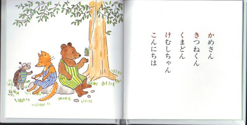 こんなふうに、「あいうえお」から「ん」まで、50音を文頭においた楽しい言葉遊びの絵本ができました。