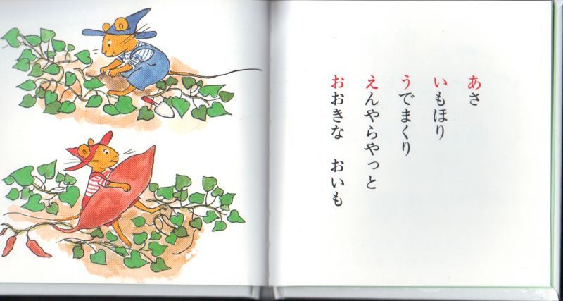 「あさ いもほり うでまくり えんやらやっと おおきなおいも」「なんとまあ にんじん ぬいたら ねっこのひげが のびほうだい」・・・