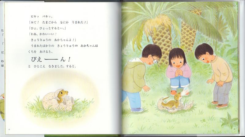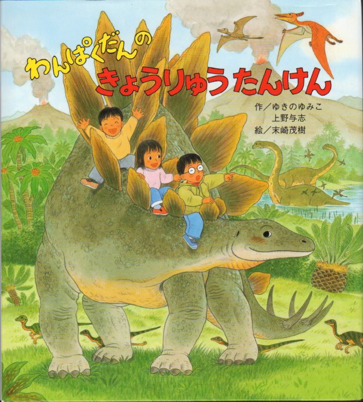 わんぱくだんシリーズ。新しくできた恐竜公園で遊んでいたわんぱくだん。滑り台で見つけた大きなたまごに導かれ、恐竜の世界へ。ワイドに広がるパノラマページも迫力充分です。
