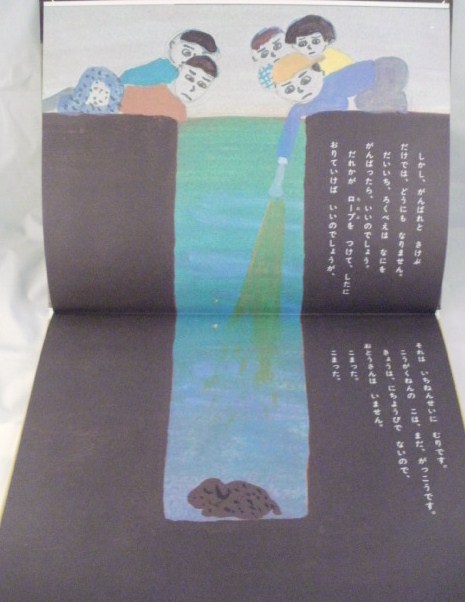 たいへんだ! 犬のろくべえが深い穴の中に落ちてしまった。