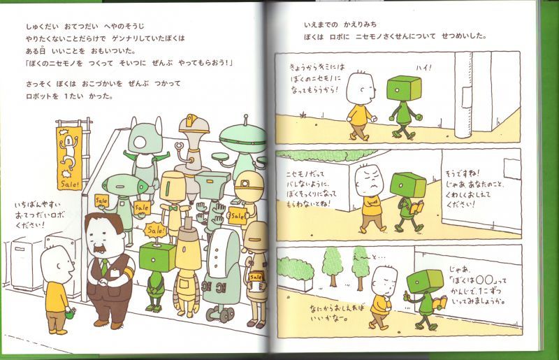 けんたくんは、やりたくないことをやらせるために、おてつだいロボを買いました。ロボは完璧なニセモノになるために、けんたくんのことをあれこれ知りたがります。「自分らしさって?」、「人からどう思われてる?」考えれば考えるほど、複雑でややこしい。だけど、なんだかちょっとたのしくなってきて......