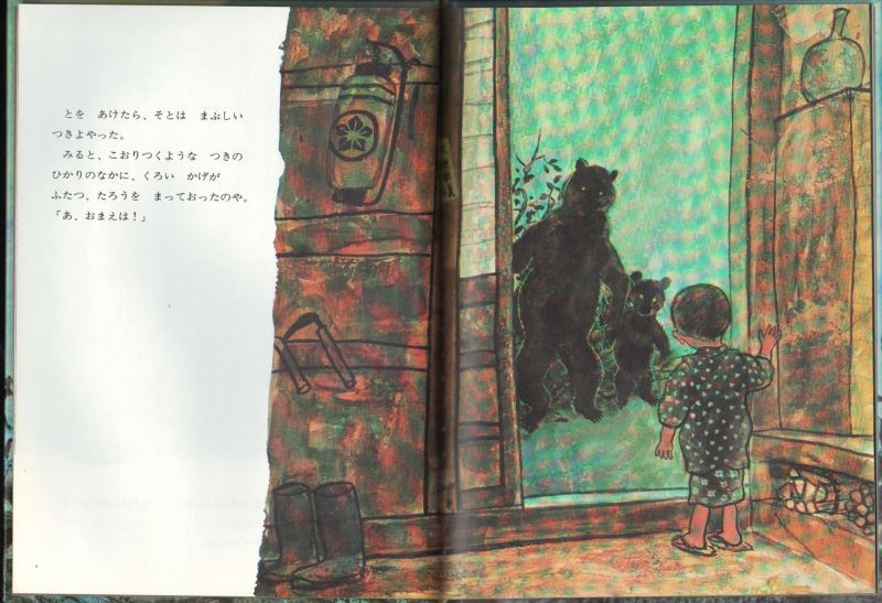 夜、父親が湖に魚を捕りにいっているあいだ、たろうは一人で留守番をしていました。戸をたたくものがいるので開けてみると、クマの親子が軽く頭を下げ去っていきました。たろうはそのクマが、去年の夏、庭で干していた梅干しを食べていたのを見逃してやったクマだったと思いだしました。あの時お腹にいた子どもが生まれたのだろうと……。静かな月夜の晩の心にしみるお話です