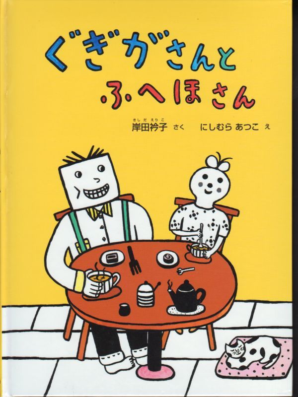 角張ってゴツゴツの「ぐぎがさん」と、まるくってフワフワの「ふへほさん」。ぐぎがさんの挨拶は「ぐがよー」、ふへほさんの挨拶は「ふはよー」。ぐぎがさんがドアを押すとドアはぐぎがさんの形に穴があき、ふへほさんはお腹がすくと浮かんでしまいます。まるで正反対のふたりだけれど、とても仲良し。ある日、ふたりは釣りをしに海にでかけます。おかしなものを釣り上げたふたりは、それぞれ「ぐぎが語」と「ふへほ語」で唱歌「うみ」を歌います。「ぐーぎーがーぎごぎーがー…」「ふーひーはーひほひーはー…」。ふたりの行動や歌がとびきり楽しい、しあわせな気持ちになる絵本です。