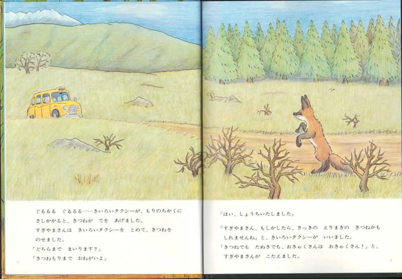 きいろいタクシーを運転している杉山さんは、野原の中の道でキツネのお客さんを乗せました。ぐるるる、ぐるるると走っていくと、タヌキ、ウサギ、イノシシの親子、ヒグマ……と動物のお客さんが次々乗ってきます。もう誰も乗せられないと思ったら、タクシーは大きなオープンカーに、そして2階バスに変身します……。童話でも登場した「きいろいタクシー」とすぎやまさんのお話です。