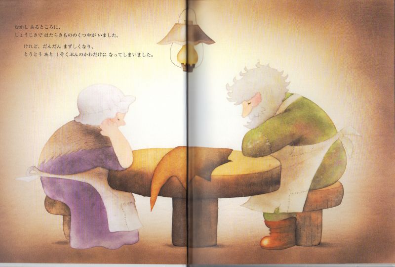 正直者の靴屋さん。でもだんだん貧しくなり、ついに靴一足分の皮だけになってしまいます。ところが翌朝、不思議なことに見事な靴ができていて、すぐに売れました。同じことが続いたある夜、靴屋さんが工房をのぞいてみると、二人のこびとがあらわれて・・・。グリム童話の名作です。