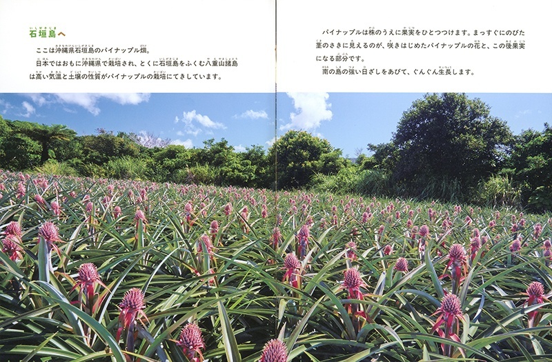 そのまま食べても、お菓子にしても、さわやかに甘くておいしいパイナップル。どんなふうにできる果物か知っていますか? パイナップルの花を見たことはありますか? パイナップルができるまでを紹介します。そして、パイナップルの栽培を日本で始めたのは、沖縄県石垣島に移住してきた台湾の人たちでした。約90年前のことです。パイナップルの歴史も描きます。