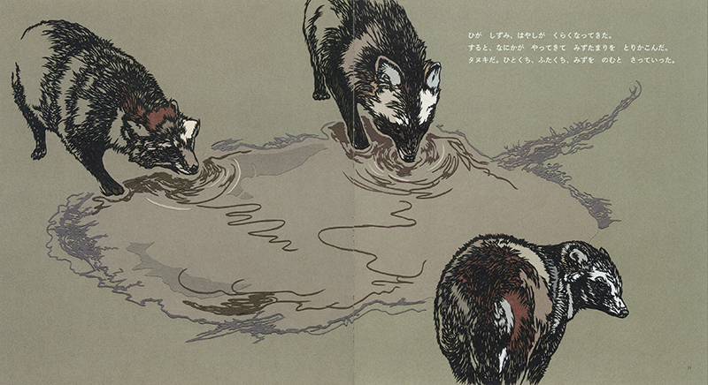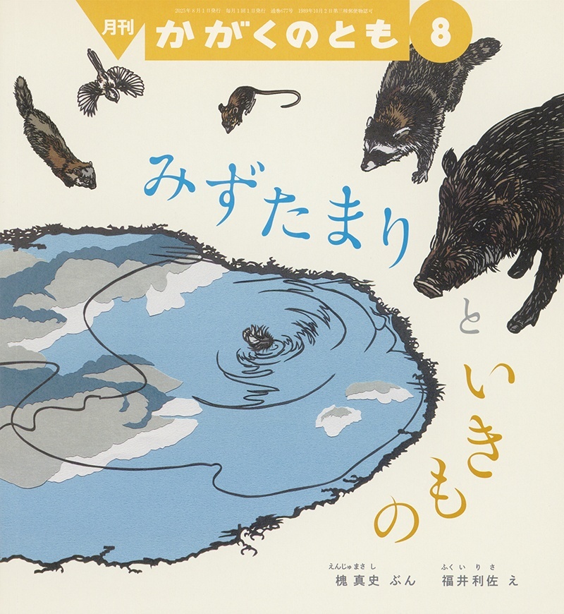 夏、林の中に大きな水たまりができました。すると、鳥がやってきて水浴びをします。日が沈むと、タヌキやイノシシなども入れかわり立ちかわりやってきて、水浴びしたり水を飲んだりしました。ある雨上がり、町の中に小さな水たまりができました。さて、何かやってくるのでしょうか? ――大きな水たまりも小さな水たまりも、じつは多様な生命を支えているのです。