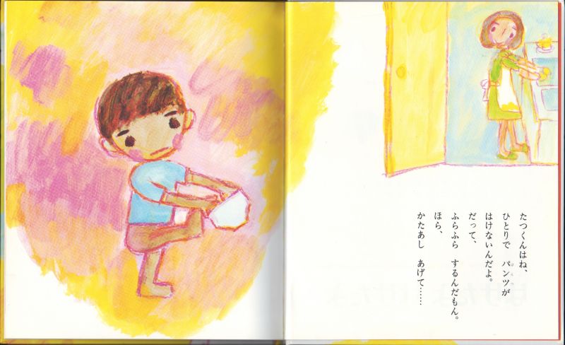 たつくんはひとりでパンツをはけない。裸のまんまで外にとびだしたら、動物たちに見られ、おしりにしっぽがないぞと笑われます。