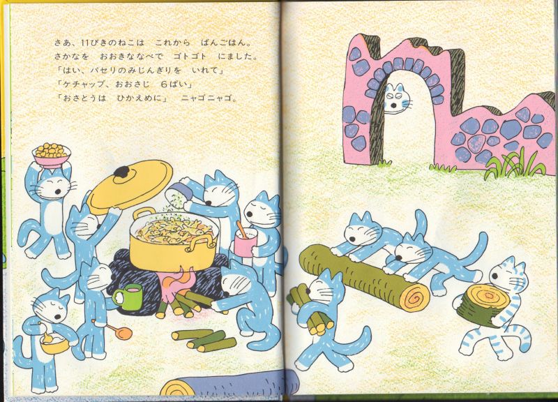 11ぴきのねこが魚釣りをしていると、水玉模様のへんなねこがあらわれました。