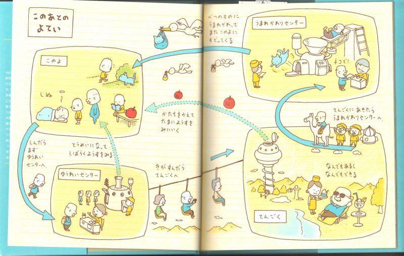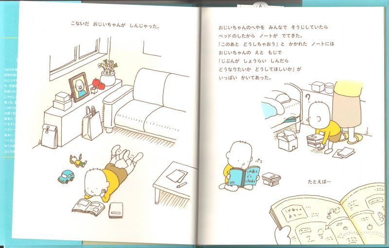 しんだおじいちゃんがかいた「このあと どうしちゃおう」ノートがでてきた。「じぶんが しょうらい しんだら どうなりたいか」が、かいてある。「うまれかわったらなりたいもの」「こんなかみさまにいてほしい」......なんだかおじいちゃん、たのしそう。でも、もしかしたらぎゃくだったのかもしれない。ぼくだったら、どうしちゃおうかな。いま、いきているあいだに、かんがえてみよう!