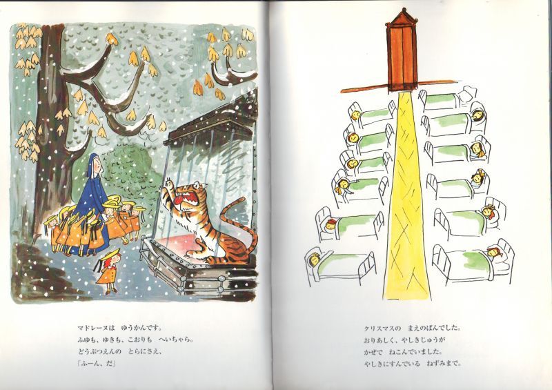 パリの、つたのからまるふるいやしきに、12にんのおんなのこたちが、2れつにならんでくらしていました。9じはんになると、てってもふっても、さんぽにでます。いちばんのおちびさんが、マドレーヌでした。半世紀以上にわたってたくさんの人に愛されてきたマドレーヌ。元気いっぱい、勇気いっぱいのマドレーヌが、クリスマス・イヴに大活躍するお話を、今いちばん輝いている作家、江國香織の訳でお届けします。