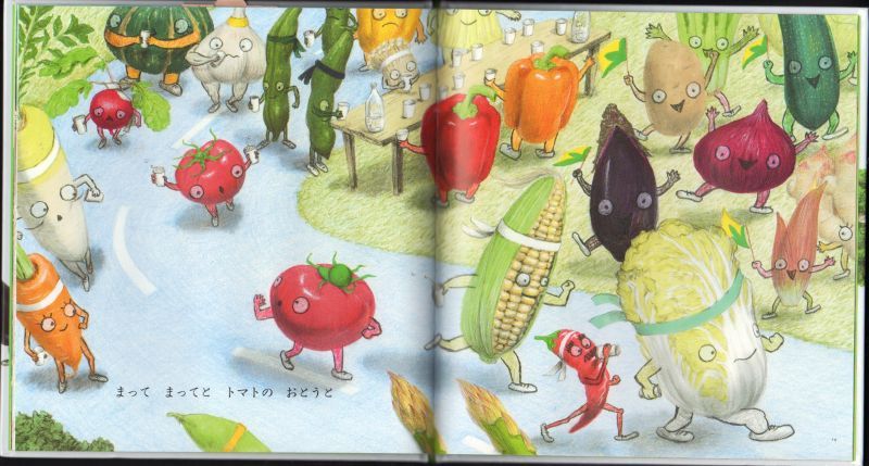 今日は野菜たちのマラソン大会。「そらまめ そろって マラソンさ」「りっぱなパセリは つっぱしる」韻を踏んだような言葉とユーモアたっぷりの絵が実に楽しい絵本です。