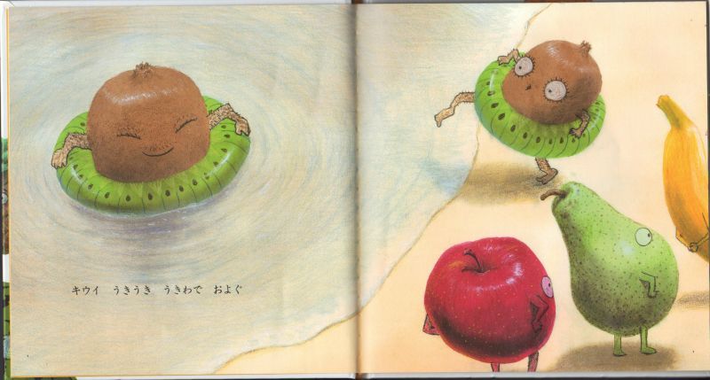 真夏の海水浴場でくり広げられる果物たちの愉快な行動を、ユーモラスな絵で描いた言葉遊びの絵本。