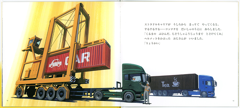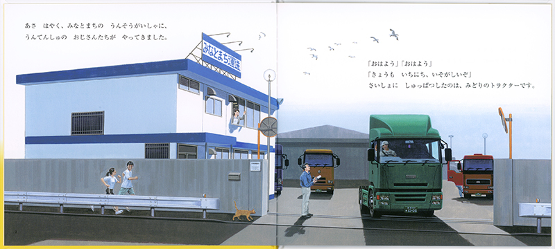 荷台がない運転席だけのトラック。そんな不思議な乗り物が、この絵本の主人公の「トラクター」です。一体何をする乗り物なのか、その姿からは想像がつきません。実は、トラクターはそのままでは何もできません。台車(トレーラー)と呼ばれる車輌と合体して初めて、その役目である荷物の運搬ができるようになるのです。トラクターがその姿を次々と変えながら、力強く躍動する様子をお楽しみください!