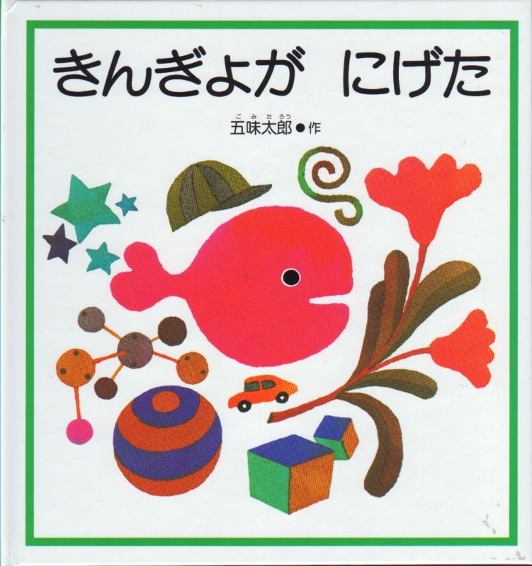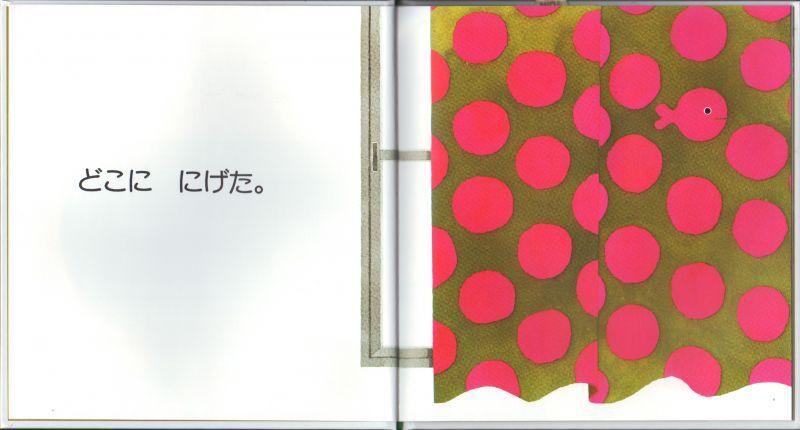 「きんぎょがにげた」「どこににげた」金魚鉢から逃げだした金魚は、カーテンのもようの中に隠れたり花の中に隠れたり。