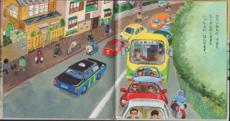 最近よく見かけるようになったコミュニティバス。路線バスが走らないような細い道を走る小型のバスです。このコミュニティバスが主人公のお話。商店街の狭い道を通り抜け、住宅街をゆっくりゆっくり走り、お客さんを乗せたり降ろしたりしながら、走ります。狭い道を器用に曲がる様子や、たくさんのお客さんの姿が描かれ、まるでバスに乗っている気分になりますよ!