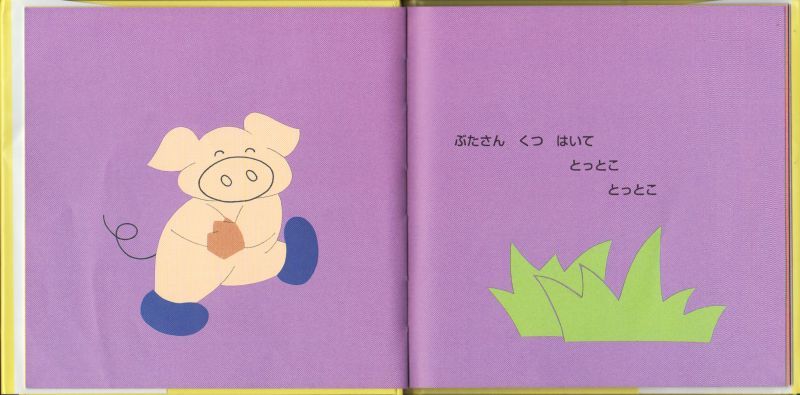 ねこさんがくつはいて、とっとこ とっとこ。次はありさん、とっとこ とっとこ。ぶたさんもくつはいて、とっとこ とっとこ。へびさんがくつはいてとーとこ とーとこ。次々くるよ、楽しい仲間。みんな一緒で楽しいな。「とっとこ とっとこ」という楽しく歩く音とともに、次々にやってくる、楽しいお友達。
